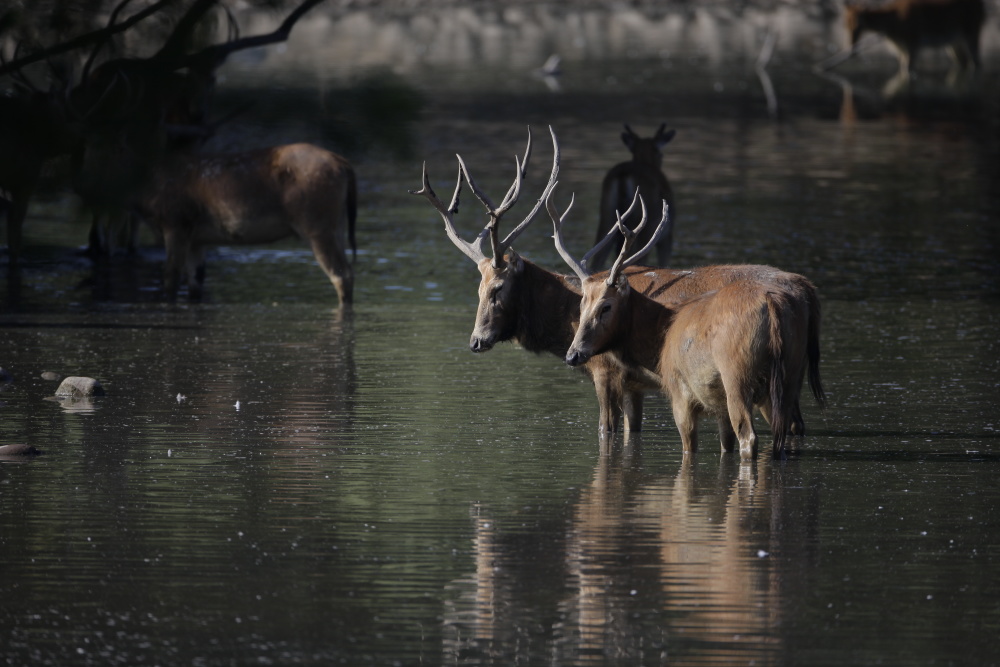 麋鹿是我国特有的珍稀物种,也是鹿科、麋鹿属唯一的鹿类动物,被列入《世界自然保护联盟濒危物种红色名录》,同时也是我国一级野生保护动物。麋鹿因为头脸狭长像马、角像鹿又与其它鹿略有不同、蹄子宽大像牛、尾细长像驴,因此我国古代时又常将之称作“四不像”。