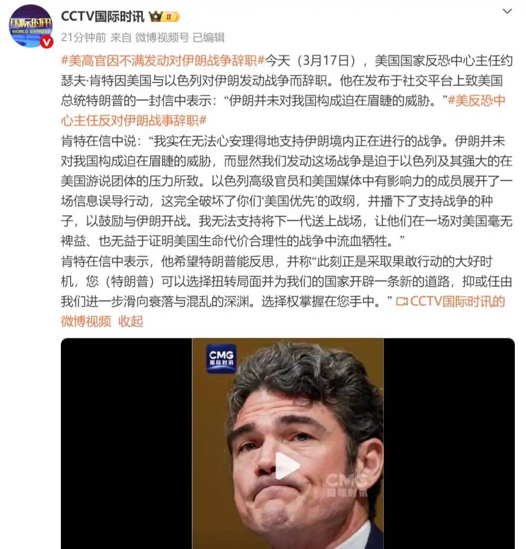 今天(3月17日),美国国家反恐中心主任约瑟夫·肯特因美国与以色列对伊朗发动战争而辞职。他在发布于社交平台上致美国总统特朗普的一封信中表示:“伊朗并未对我国构成迫在眉睫的威胁。”肯特在信中说:“我实在无法心安理得地支持伊朗境内正在进行的战争。伊朗并未对我国构成迫在眉睫的威胁,而显然我们发动这场战争是迫于以色列及其强大的在美国游说团体的压力所致。以色列高级官员和美国媒体中有影响力的成员展开了一场信息误导行动,这完全破坏了你们‘美国优先’的政纲,并播下了支持战争的种子,以鼓励与伊朗开战。我无法支持将下一代送上战场,让他们在一场对美国毫无裨益、也无益于证明美国生命代价合理性的战争中流血牺牲。”肯特在信中表示,他希望特朗普能反思,并称“此刻正是采取果敢行动的大好时机,您(特朗普)可以选择扭转局面并为我们的国家开辟一条新的道路,抑或任由我们进一步滑向衰落与混乱的深渊。选择权掌握在您手中。”